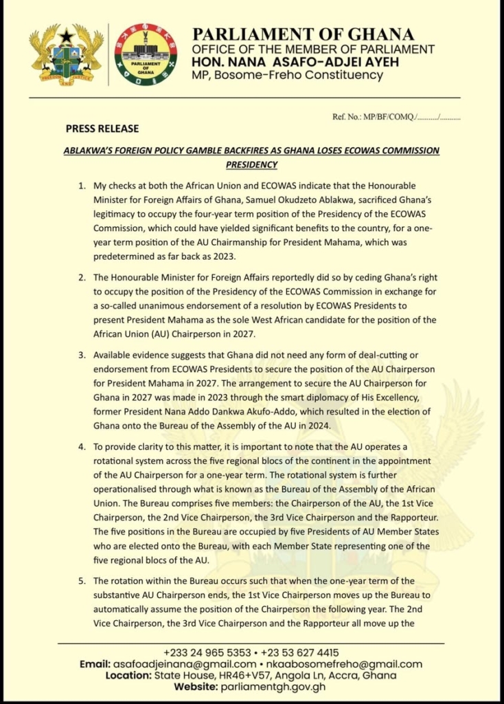 The Member of Parliament for Bosome Freho, Nana Asafo-Adjei Ayeh, has accused the Minister for Foreign Affairs, Samuel Okudzeto Ablakwa, of relinquishing Ghana’s chance to assume the Presidency of the ECOWAS Commission in return for what he claims was an already “prearranged” bid for President John Mahama to become African Union (AU) Chairperson in 2027.